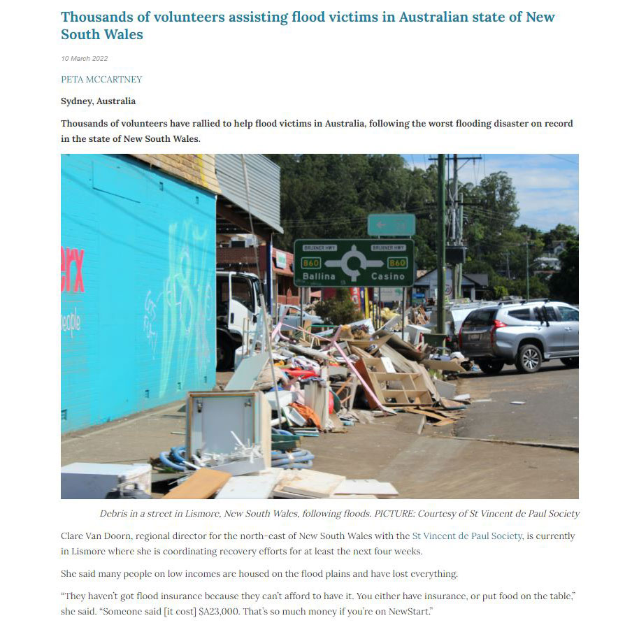 The Society was the first major charity to distribute financial grants, up to $3,000, to households impacted by the floods that devastated Northern NSW. Thanks to the coverage generated in the mainstream media, the Vinnies NSW Flood Appeal was able to raise $3.8 million to help people recover and rebuild.