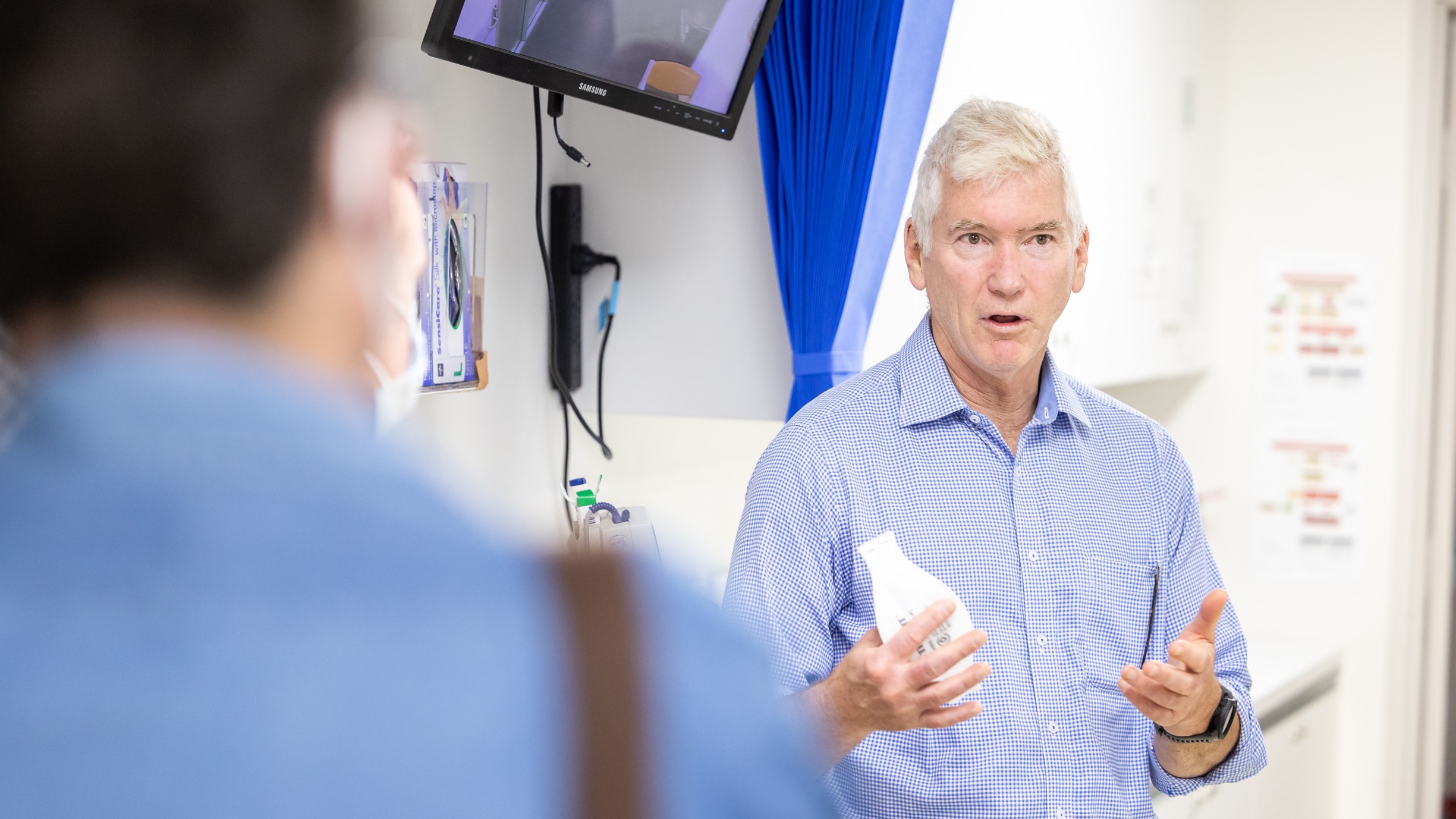 Dr Olav Nielssen, a psychiatrist who treats patients at the Matthew Talbot Hostel Clinic, tells visitors to the Hostel about his work.